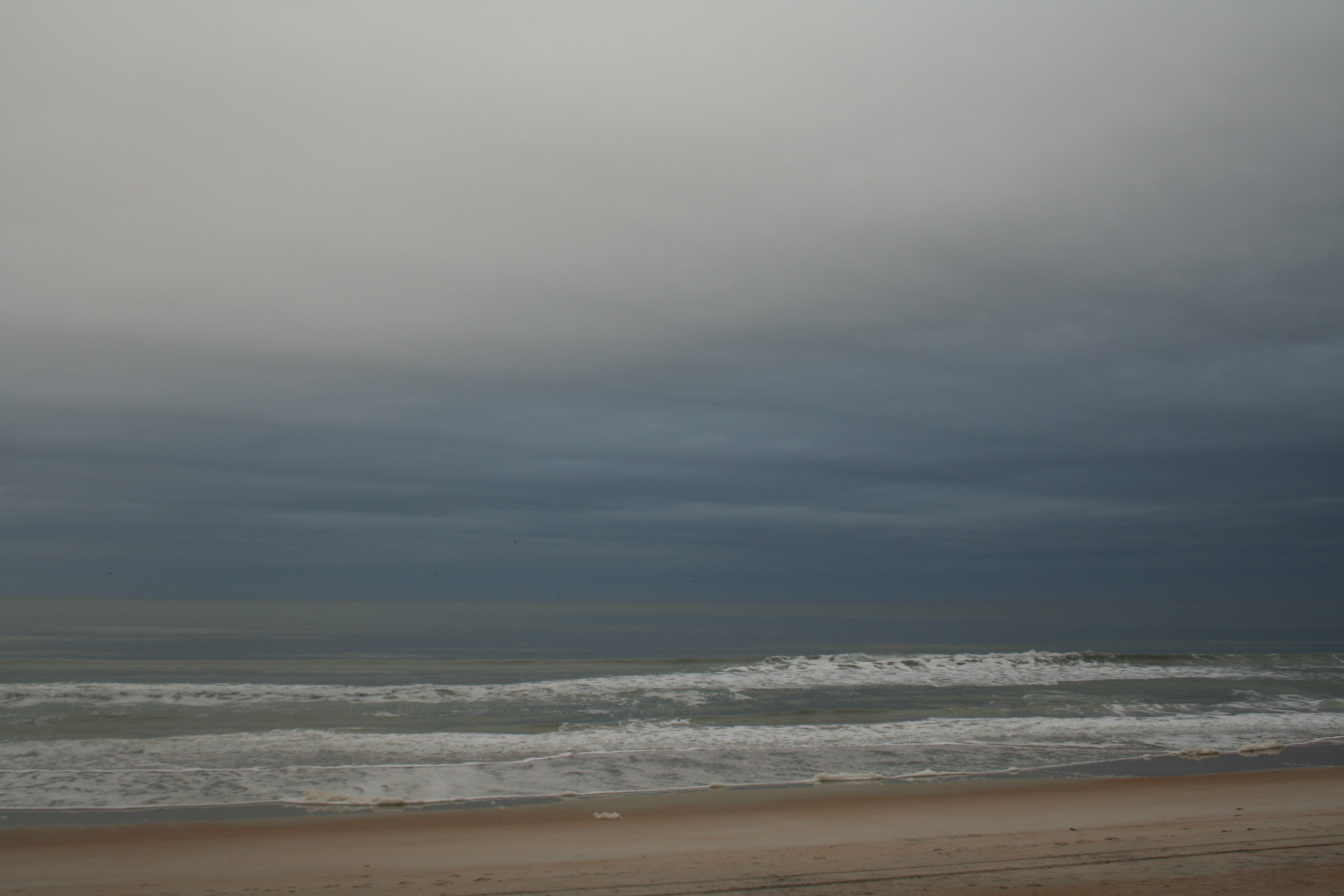 Managed an early run on the beach in spite of aching knees. Saw many dead starfish; some immature Laughing Gulls; a substantial gang of Gray Gulls with a single Skimmer in their midst, looking lost. Rolls of somehow comforting Payne’s Gray clouds, deepening in hue miles out where the rain still fell.