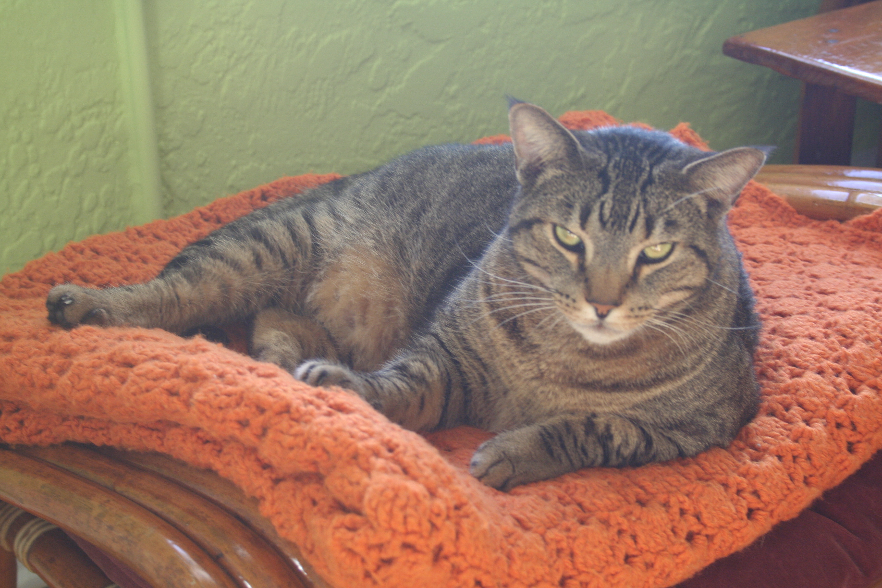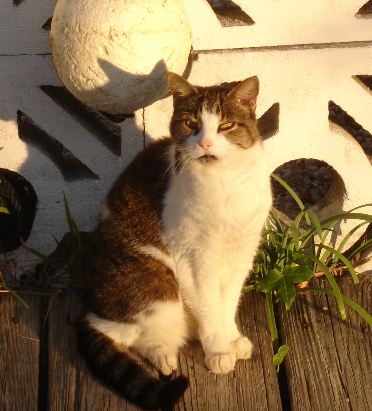 Cecil was a big, good-natured sweetie. Topping twenty pounds, eating was naturally his sole priority. He would bang on the back screen door with his head every morning at 5 a.m., demanding to be fed, which worked out because that’s when we needed to get up in those work days. No need to set an alarm with Cecil around. When not eating he stayed almost exclusively in the back, sleeping on the deck or out somewhere in the jungle. He liked to sleep in one of those big terracotta pot plates, curled to fit as best he could, but most of him hanging out. He was a pacifist by nature, with a squeaky little raspy cry belying his size, but he was ferocious when cornered or challenged by the occasional stray that might appear, and could inflict serious damage. Certainly no lap kitty, he was, nevertheless, truly affectionate, and loved to have his head scratched, looking up at you with those little crossed eyes. He lived for twelve years, and died while we were on one of our western trips. He’s buried in the jungle, just down from the deck he loved.