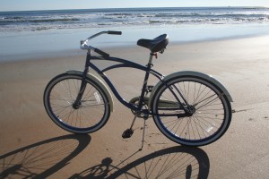 The hurricanes of ’04 took out so much sand we had no beach to walk, run, or ride on in winter, even at low tide. Summers were better– the lows are lower in summer– but it really wasn’t near what it had been until last summer. This winter has been good; lots more beach to work with at low tide, so it’s been filling in nicely. Clear, sunny, and much warmer this morning, so Papa took advantage of a 10:00 low and took off on the cruiser.