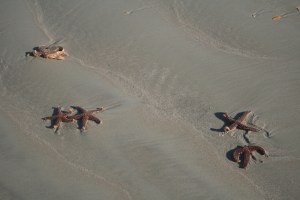 I came upon a patch of dead starfish, thirty or more, in an area maybe twenty yards square. You see them frequently, but usually more spread out than this. I don’t know what kills them. They are naturally very mobile, so I don’t think they are left alive by a falling tide and then die. Some days there appears to be a die-off of a particular species, certain crabs, for instance, or a bi-valve. Last fall there were a lot of horseshoe crabs, and I’ve found a couple of dead dolphin, and one very old green turtle. The females return throughout their lives to lay eggs on the very beach on which they were hatched, and they can live two-hundred years or more. The one I found could have been coming back here since the Second Spanish Period.