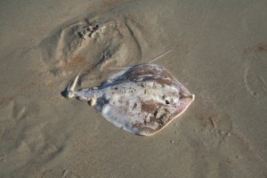 Two dead rays, a quarter-mile apart, the gulls feasting. you see them frequently on clear water days, usually in small groups, but the past two summers we were fortunate to witness huge migrations. One lasted for several hours. We sat on the beach deck and watched thousands go by, illuminated in the breaking waves by the late sun. They were small rays, like this one, maybe a foot across, with brown tops and white undersides. In May you see the big Manta Rays with ten-foot wing spans catapulting out of the water in prodigious leaps, usually a good ways out, but they come into the shallows to feed, too. I was out on the board one day and one swam right under me. They actually fly under water with big, slow undulations, their wingtips frequently breaking the surface. When I first saw this one I thought it was two sharks swimming ten or twelve feet apart–the wingtips look like dorsal fins–and then I saw his great dark body.
