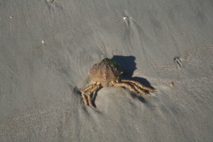 I turned around after two and a half miles, and found the wind a little tough to pedal against coming back. About half-way home I came upon this crab. You usually see blue crabs and sand crabs washed in, but I’ve been seeing more of this one recently. I don’t know what it is, but it looks like a rock, so maybe it’s some kind of stone crab. Quite a tough-looking guy, and maybe one of those rascal bait-stealers that likes to deplete my shrimp supply.