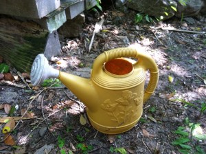 plants and I have established a morning watering ritual three days a week. No hose, it is individualized and respectful, a labor-intensive method by choice and ethics, using a watering can. We started years ago with a galvanized tin watering can, but it has long since rusted and disintegrated. In short, the bottom has fallen out, but there was no accompanying sense of Enlightenment as I had been led to believe might occur. We don’t like to water with a hose or sprinkler at this stage because it is so wasteful. Watering with a can is very directed– just the base of each plant receives water– so there is almost no waste. We use collected rainwater as long as we have it, and when that is gone, as it is now, I fill the can with water from a spigot, and must, of course, make several trips.