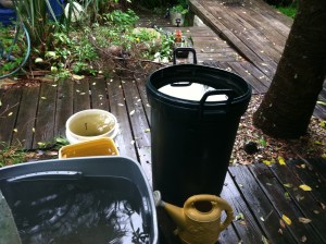 We put out everything we could find that might hold water to collect what we could for the dry time coming. The garden is saturated. I think with the expected sun tomorrow everything will grow about six inches. Looking good so far.