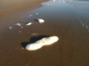 Nothing on the beach but birds and these sea-foam sculptures. They are intricate structures of millions of tiny bubbles adhering to each other, through surface tension, I guess, making extraordinary kinetic works of art that sway in the breeze and, in the first low rays of the sun, glow with an inner light, each individual bubble illuminated and defined, like little rooms. Also known as spume, which sounds deeply suggestive of the ocean’s relationship to the womb, it is created when sea water containing high concentrations of dissolved organic matter is agitated, trapping air in bubbles, which then gets blown around. So there.