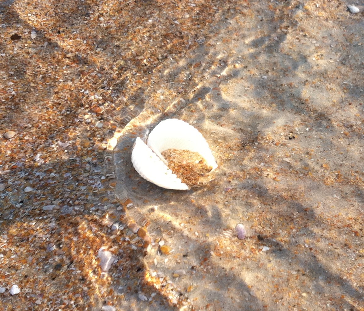 about bivalves in general this morning. Virtually every shell you find on the beach, with the exception of the conch, murex, and whelk families, which are a kind of spiral construction, are bivalves, meaning there are two nearly identical halves, connected by a flexible ligament called a hinge. There are more than 9000 species of bivalves. Some attach to surfaces, some move with currents, some have a digging foot, and some, like scallops, can swim. Every now and then we find a bivalve (pictured) with the hinge still intact, but by far what you find is one or the other half of one, constituting everybody’s sea shell collection. I am amazed by the variety and sheer numbers of bivalves in the oceans of the world, and right here on the beaches of Skinny Island. Everywhere you look in the little hacienda, and even outside are shells. We’ve got some pretty exotic-looking things, and lots and lots of common but beautiful representatives. We’ve got jars of shells, boxes of