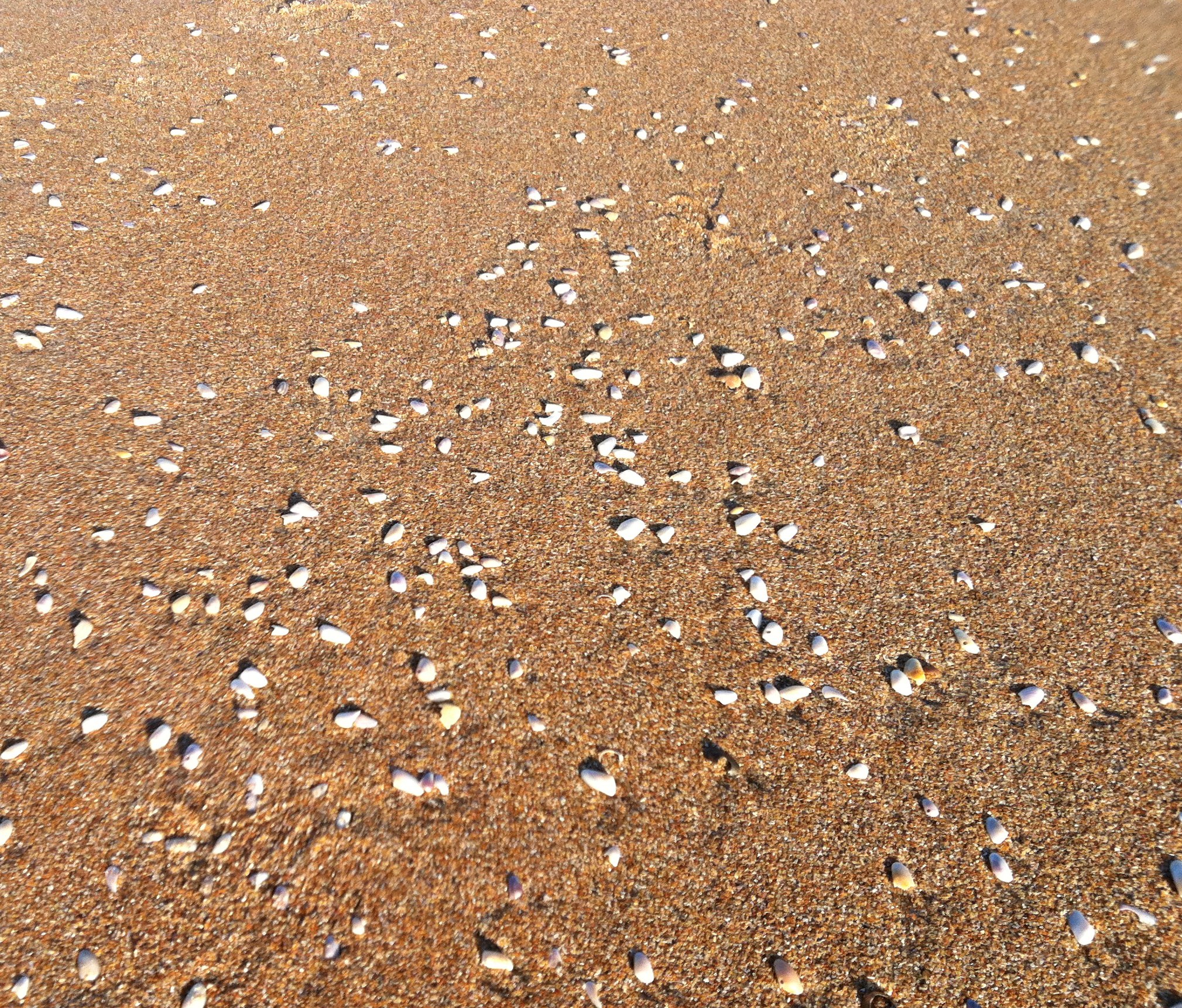 Starting to see many more Coquina Clams on the beach. For the uninitiated, uninformed, or just plain slow, Coquina Clams, Donax variabilis, are a tiny (usually less than 2.5 cm) bivalve found in abundance on many beaches, especially in the southeast. Its presence is indicative of a healthy inshore ocean. A filter feeder, it is an important link in the food chain, consuming small organic particles and algae, then consumed by fish like whiting, and shore birds. They are more
