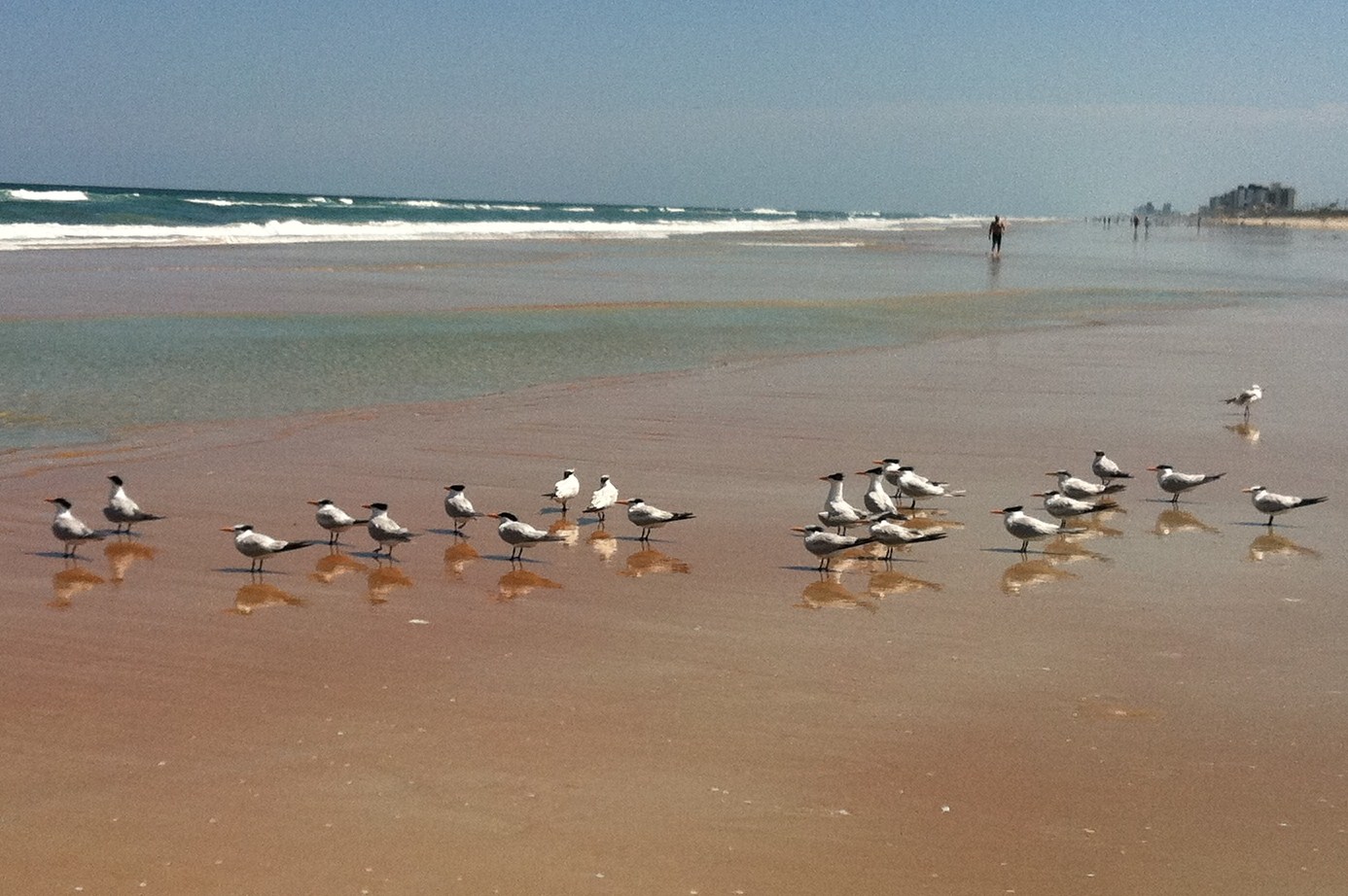 They winter here and like to mix with the Skimmers, maybe because of the orange beak similarity, but they hang around into summer long after the Skimmers have gone. A very vocal bird, they have family arguments that might include twenty or thirty members all squawking loudly with their heads thrown back. Lots of fun to watch. A very dressy bird for the beach scene they have grayish feathered backs and white bellies, a bright orange beak, and a tuft of black feather atop the head that’s kind of spiked. I think they all look like Rod Stewart. Like most northern visitors, they don’t do extreme heat very well, so most of these guys will be gone by June.