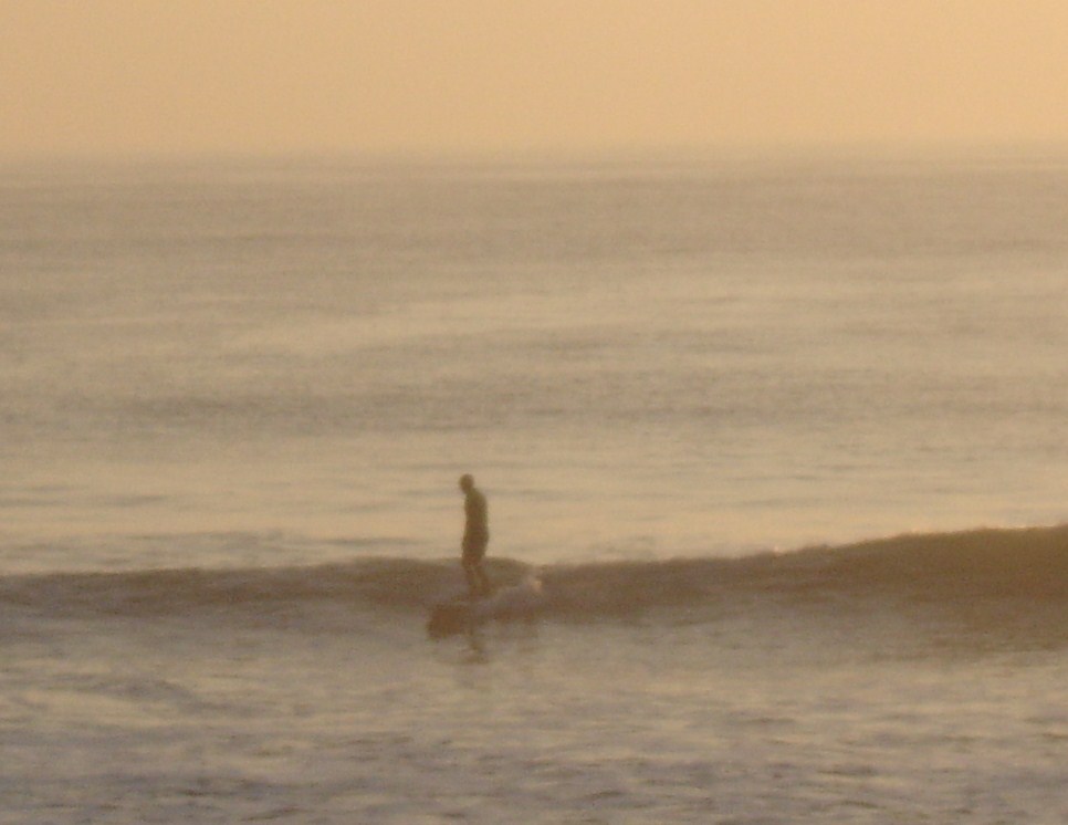 And it’s always a game you never really win. I’ve learned to not take the first wave of a set– the second or third are always better– pick one off, then get pounded on the way back out by some big rogue I should have waited for. But on days like today, there’s plenty to go around. Sun going from orange to yellow to white, the water shining all the way out, breaking into sparkles when a set approached. Everything else, the rides themselves, very hard to express, I think because there is no gap, no distance whatsoever between you and the event, no object or subject. Nothing to say. I feel I should try, but I couldn’t do it justice. Just unconnected images; the rush of feeling the tail of the board lift when you merge with the wave; the effortless standing; a long green wall opening, moving ahead, you stuck in it, with it; sunlight through the back of the wave where you trail a hand in liquid glass; glimpses of the sandy bottom in just-right light. Full, expansive, limitless, and over in seconds.