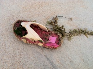 April; so far, in the month we usually start getting good waves, nothing but junk. I was thinking about that as I finished the walk this morning, and came upon this flip-flop all encrusted with sea stuff. Good punctuation, I’d say. Visual aide, perhaps. Concrete imagery. Sometimes the universe whispers; sometimes it hollers.