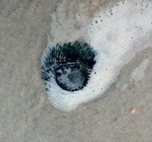This is a Blue-Button Jellyfish, another casualty of the on-shore winds. Hundreds on the beach this morning. It’s called a jellyfish, but it is actually a Chrondrophore, a colony of polyps living symbiotically. Everybody has a job. Some form the central disc, some the tentacles. A small creature, 1.5 inches across at best, they are a beautiful deep blue and turquoise, with occasional yellow thrown in. Normally a floating resident of the Gulf Stream, and like the Portuguese Man of War, lacking an independent means of mobility, they are at the mercy of wind and current, but then, who isn’t, really. No turtle nests noted yet within my small (1.5 mile) world of beach, but it is still early. The season runs from May 1 to October 31. They usually start showing up pretty regularly in June, with a few scouts coming ashore in May.