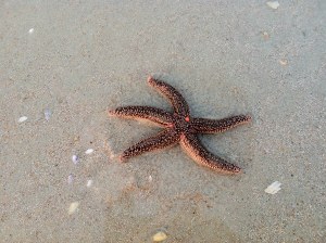 Found this specimen on the beach this morning as well, just known as the Red Starfish in these parts. They’re called a star fish or a sea star, but they’re not a fish at all, of course, but an echinoderm, which includes sea urchins and sand dollars. There are more than 2000 different species of these critters around the world. Besides the well-known ability of many species of starfish to regenerate arms, (and some, completely new starfish) they have, like other echinoderms, a pretty gnarly way of feeding on clams, oysters, and other shellfish. With their suction-cup lined feet they pry open the shell, and then a stomach thing emerges from it mouth, enveloping and ultimately digesting the tasty mollusk, then withdraws back into the star. Talk about eating out. You think about what’s going on out there too much, it’ll keep you up at night. We see a lot of this red one, and another that mostly black, with white striping around the star edges, but rarely any other species.