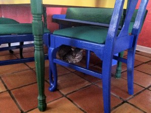 Worn out from it all, Pico has sought cool and quiet on the tile under the table.