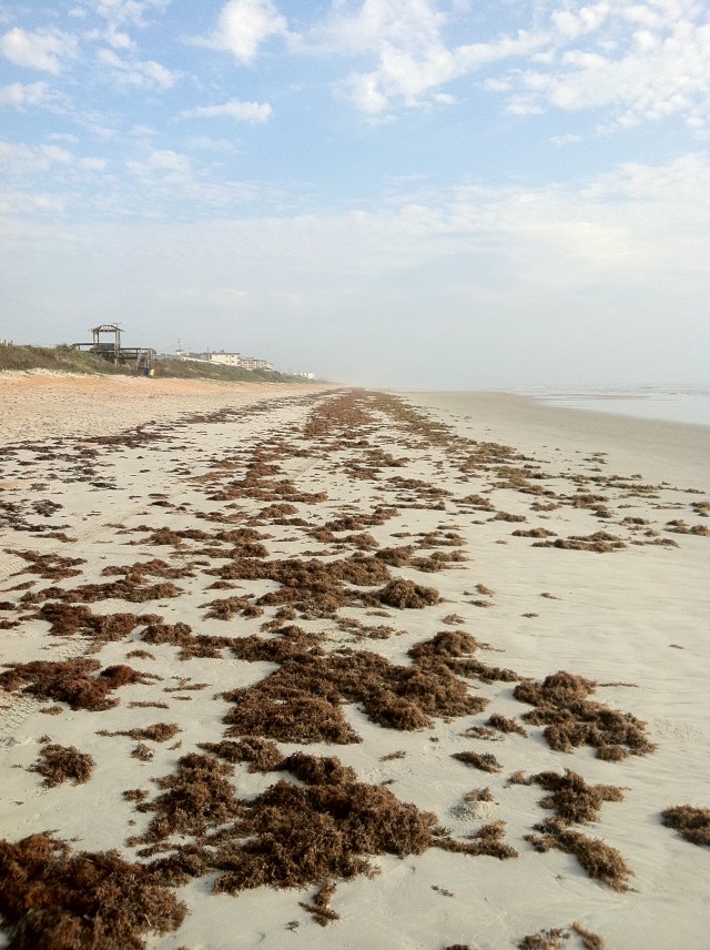 We’ve had east winds the past five days, light in the morning, then building to 15 to 20 in late afternoon, resulting in copious amounts of Gulfweed, (Sargasso) blown in from the Gulf Stream. Much of it gets left in a line on the beach at high tide, as seen above, but a lot remains in the water. This happens several times a year and it takes weeks for the natural clean-up to occur, which leads invariably to complaints by folks who find it unsightly on the beach and an inconvenience in the water. Then there’s the smell. This stuff starts emitting a pretty strong odor after a few days of being piled up like this. I believe that’s called decomposition. This too, of course, is offensive to some, the final indignity, you might say. I rather like it. It’s a healthy ocean smell. Especially at night, when the traffic has stopped, and all you hear are the waves on the beach.