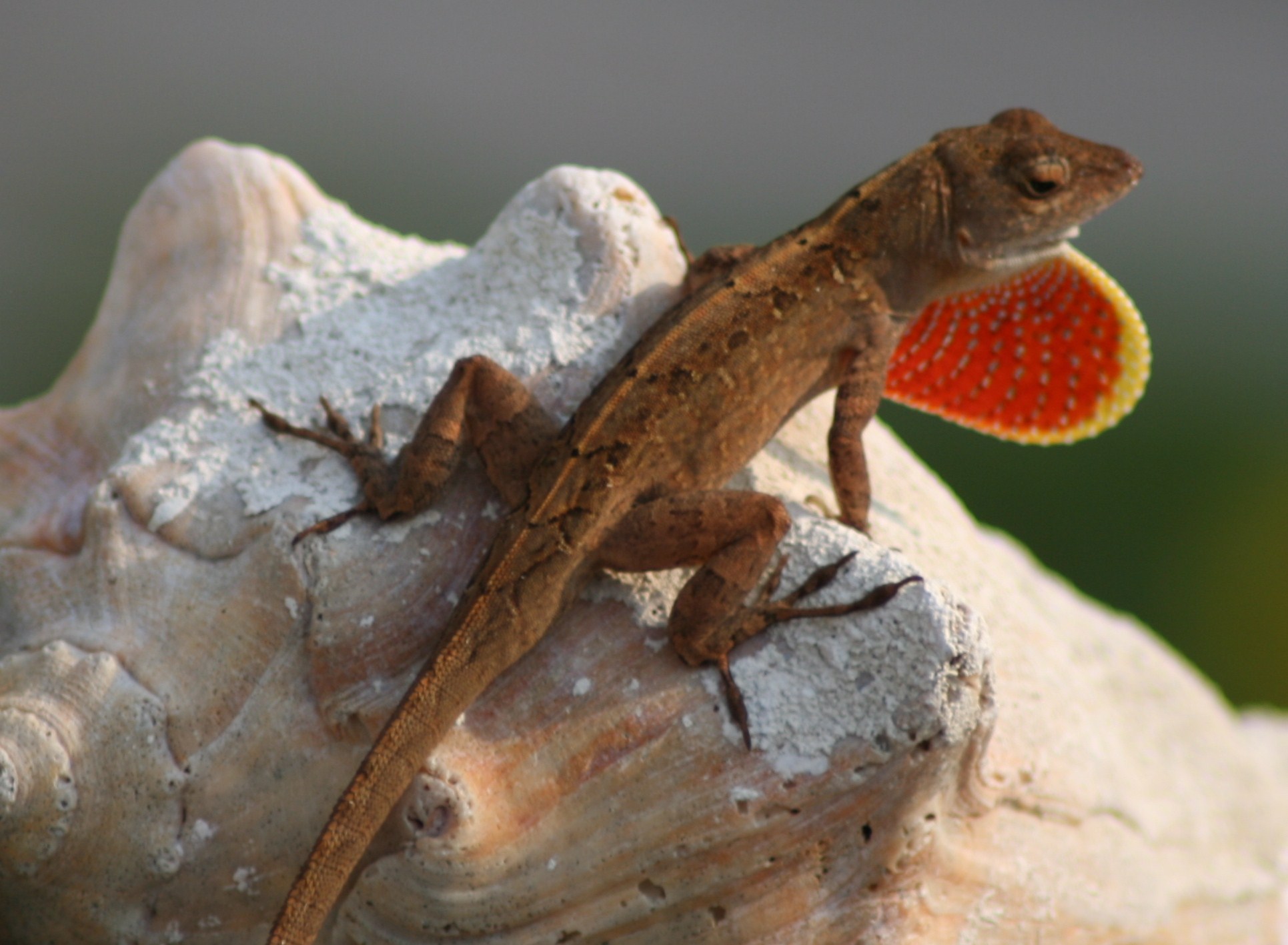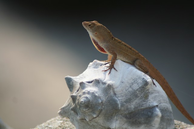 This guy, a Brown Anole, was putting on a show as I sunned on the deck after the surf. He climbed up onto an ancient conch shell and turned this way and that, making sure I could see his lovely red throat sack when it flared. I did. very impressive here, as well. They are so cocky, territorial, and aggressive. Glad they don’t get any bigger than they do.