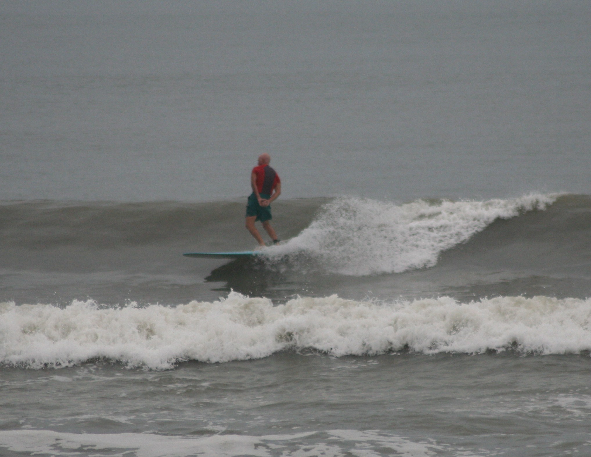 A 7 a.m. paddle-out proved it better than it looked from shore. Falling tide, long interval, thick, speedy waves with 6-7 foot faces. Partly cloudy when I got out, the sky quickly went to overcast, and then the sky and water were the same pale grey, very spooky. Much mullet activity and visible evidence of some feeding going on to add to the enjoyment level. (We saw a six-foot black-tip tear into some mullet as we were swimming a few days ago, and after I got out this morning a guy I met on the sidewalk said he saw a 6-7 foot hammerhead close in down by the submarine tower at 6:30.) Naw.