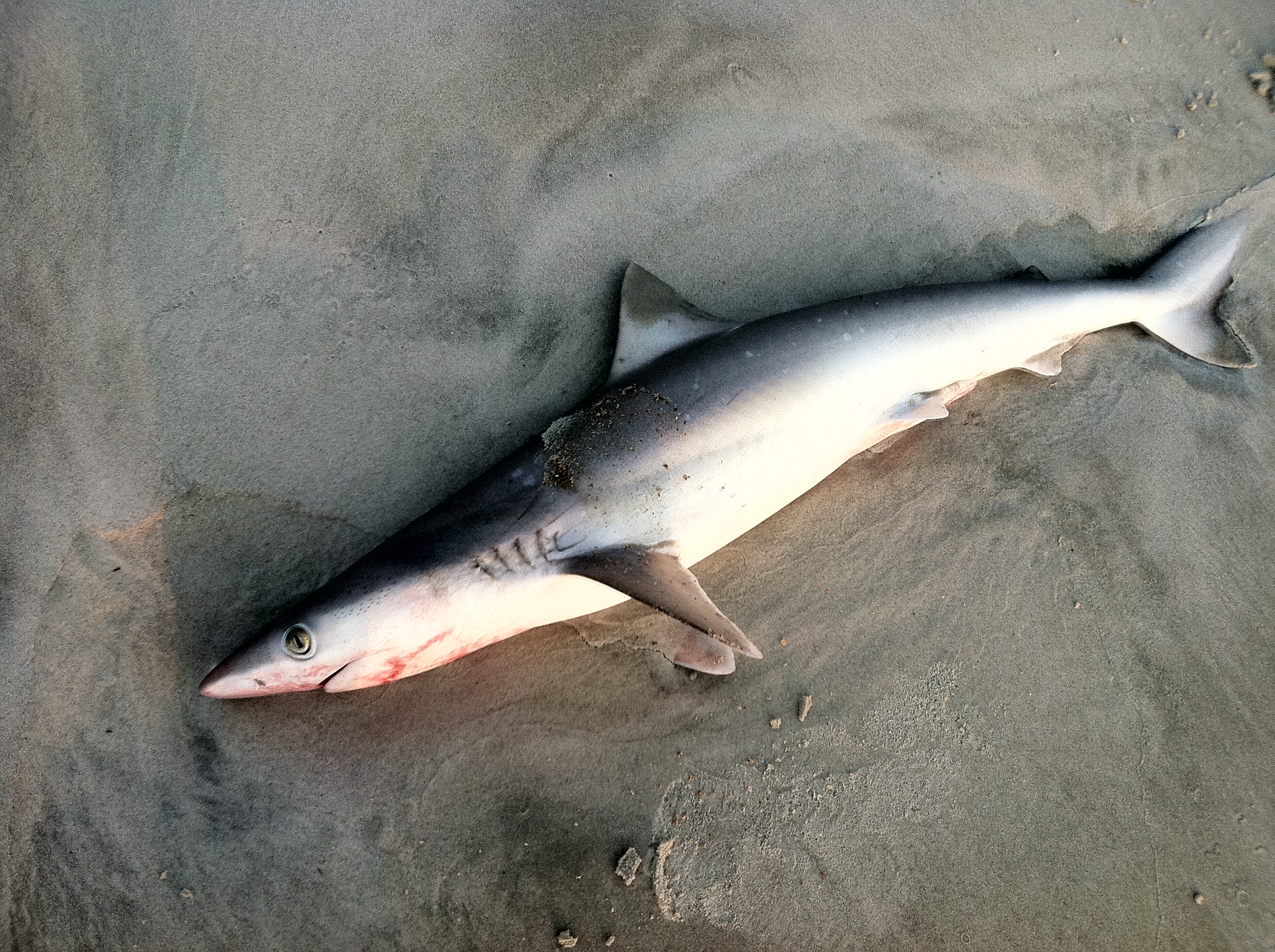 Found this guy on the beach this morning as well. Looks like he’d been hooked, and the fisherman didn’t know what to do with him. He’s a Spinner Shark, about 3 1/2 ft. They’re about 6-ft fully grown. You sometimes see Spinners this size flying out of the water after mullet, and executing a spinning motion, hence the name. What a piece of design he is, too. Unbelievably sleek and efficient. I know; evolution; and I’m a total subscriber. I’m just saying, again.