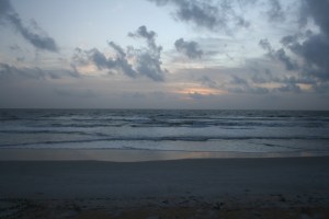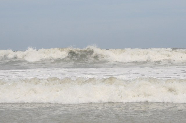 The wind picked up a little overnight, but nothing to fret about; surf building from the sound. Sunrise presented a fairly tranquil scene; waves cresting at 6-8 feet, winds from the east at 10-12 mph; scattered clouds blowing in fast from sea, but no rain.