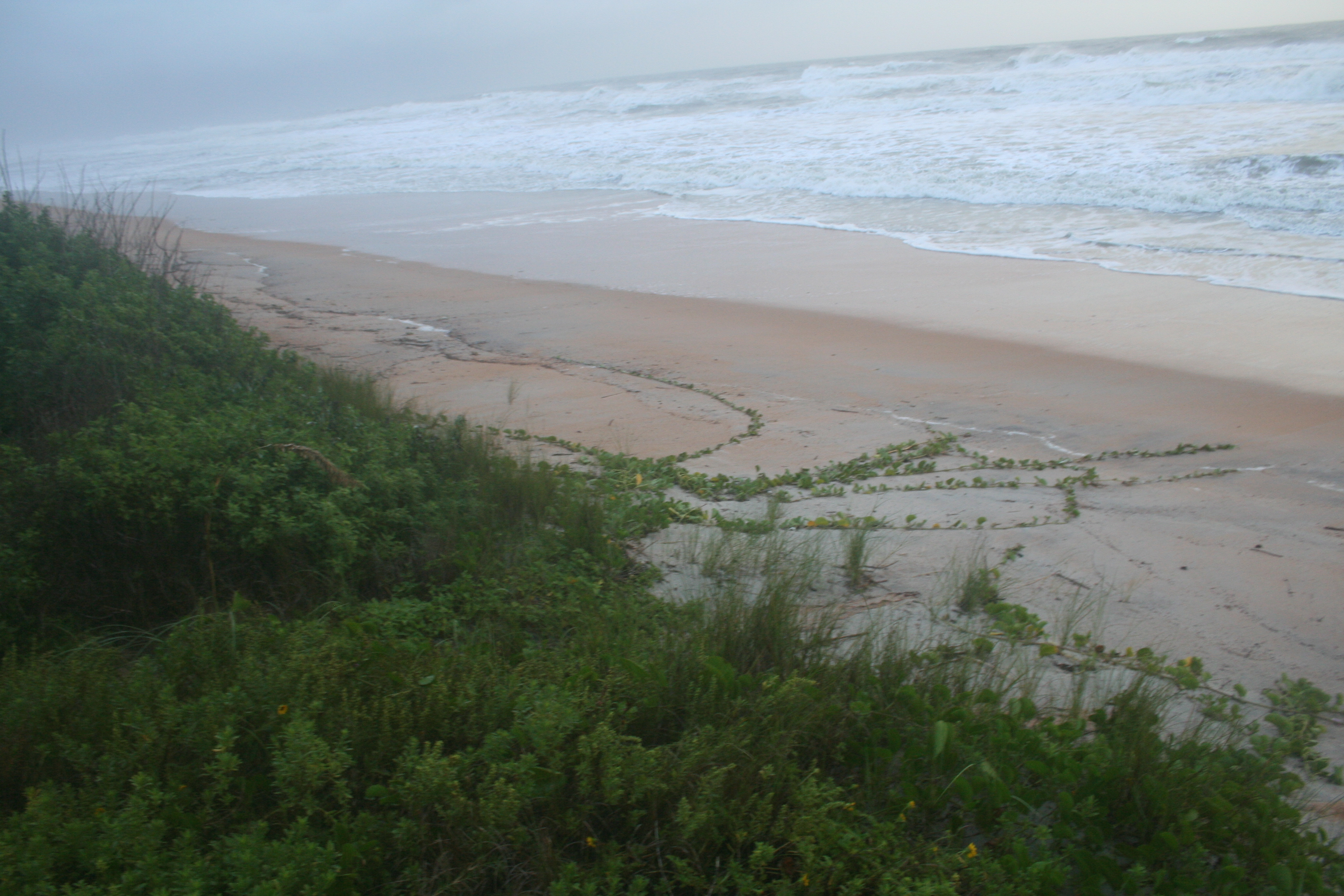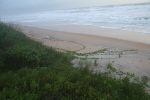 No discernible erosion; high tide again about 6:30 this morning. Maybe lost a little sand, but nothing like the 12-foot cliff left after Charley in ’04 took out most of the beach. Looks like the morning glory vines survived.
