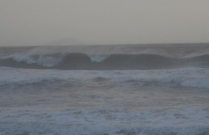 A few rain bands blew in overnight with some intensity, but overall it was fairly quiet, except for the low, constant roar of a very disturbed ocean, of course. Intermittent rain this morning as Irene moves north, directly opposite us at about 7 this morning. Winds starting to shift to north and northwest, cleaning off the faces of incoming waves, still maxing out in the 10-12 foot range. Some breaking at least a half-mile out. Quite the sight through the mist and rain, the spray blowing off the tops in long, thin curtains.