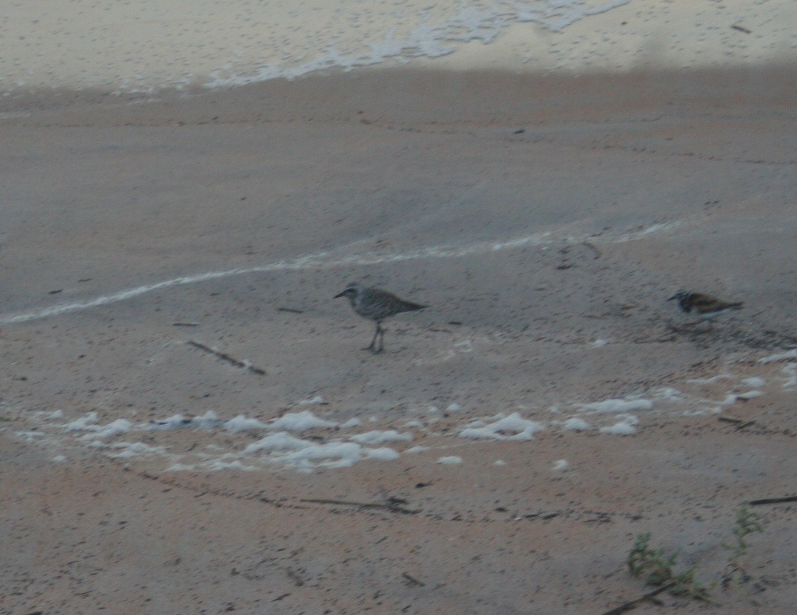 A few shore birds out picking through sand and debris this morning. Nothing much seems to phase them. They hunker down through the worst, then pick up where they left off. This is a Black Belly Plover and a Golden Plover, teaming up, I guess.