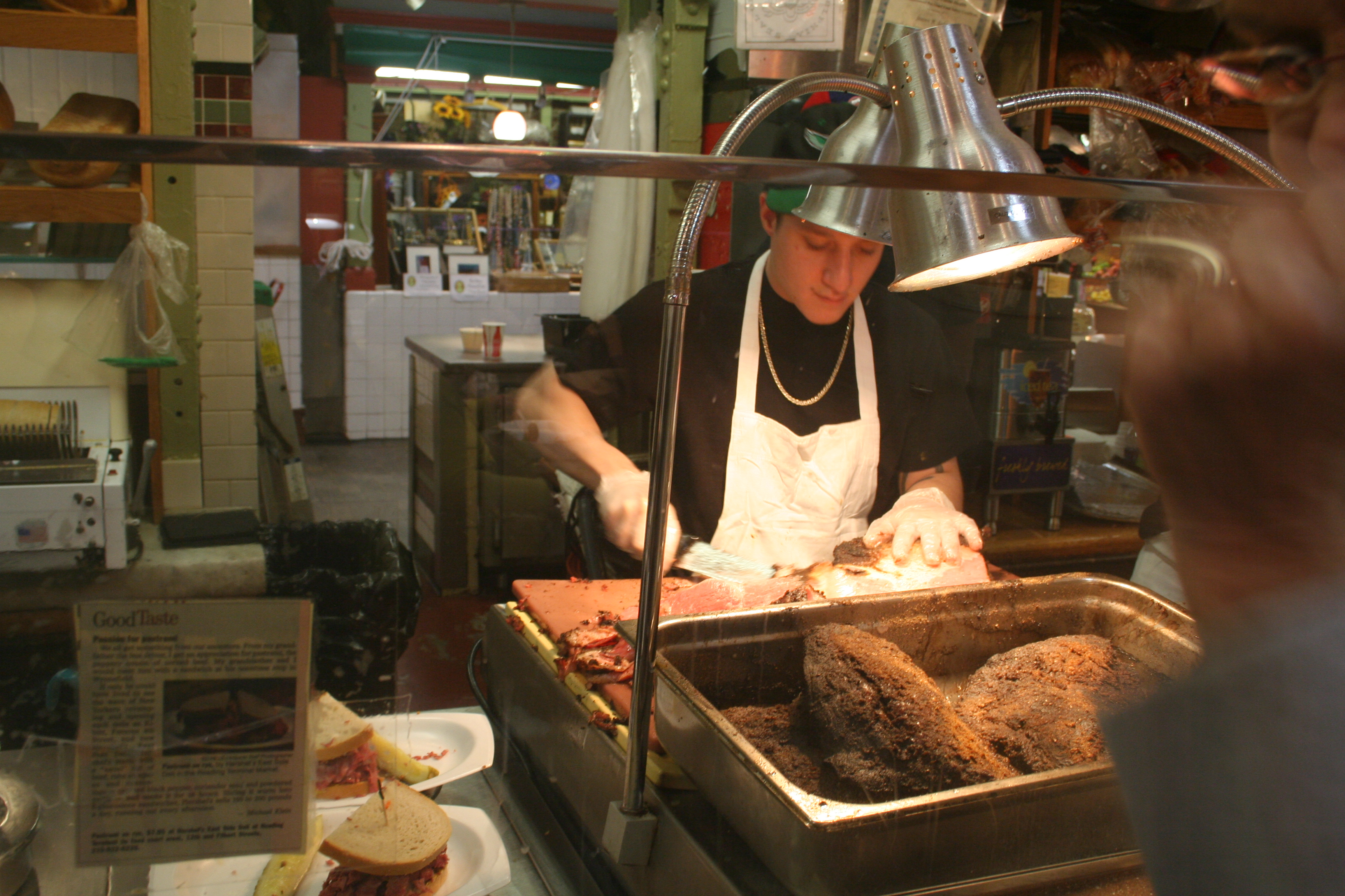 We parked in a garage and toured a wonderful indoor market place consisting of dozens of food vendors of every description, from vegetable and fish markets, to pizza and deli sandwiches, to breads and unbelievably tempting desserts. Very European, and predictive of things to come. This place was huge, and bustling with a lunch-time crowd. We made a pretty thorough inspection, somehow managing not to indulge at this point, then set off to meet Dayle’s husband Steve, who had promised to take us to his favorite place for Philly Cheese Steak. We weren’t even in Europe yet, and the trip was already about food.
