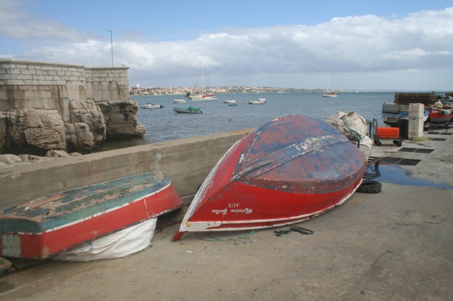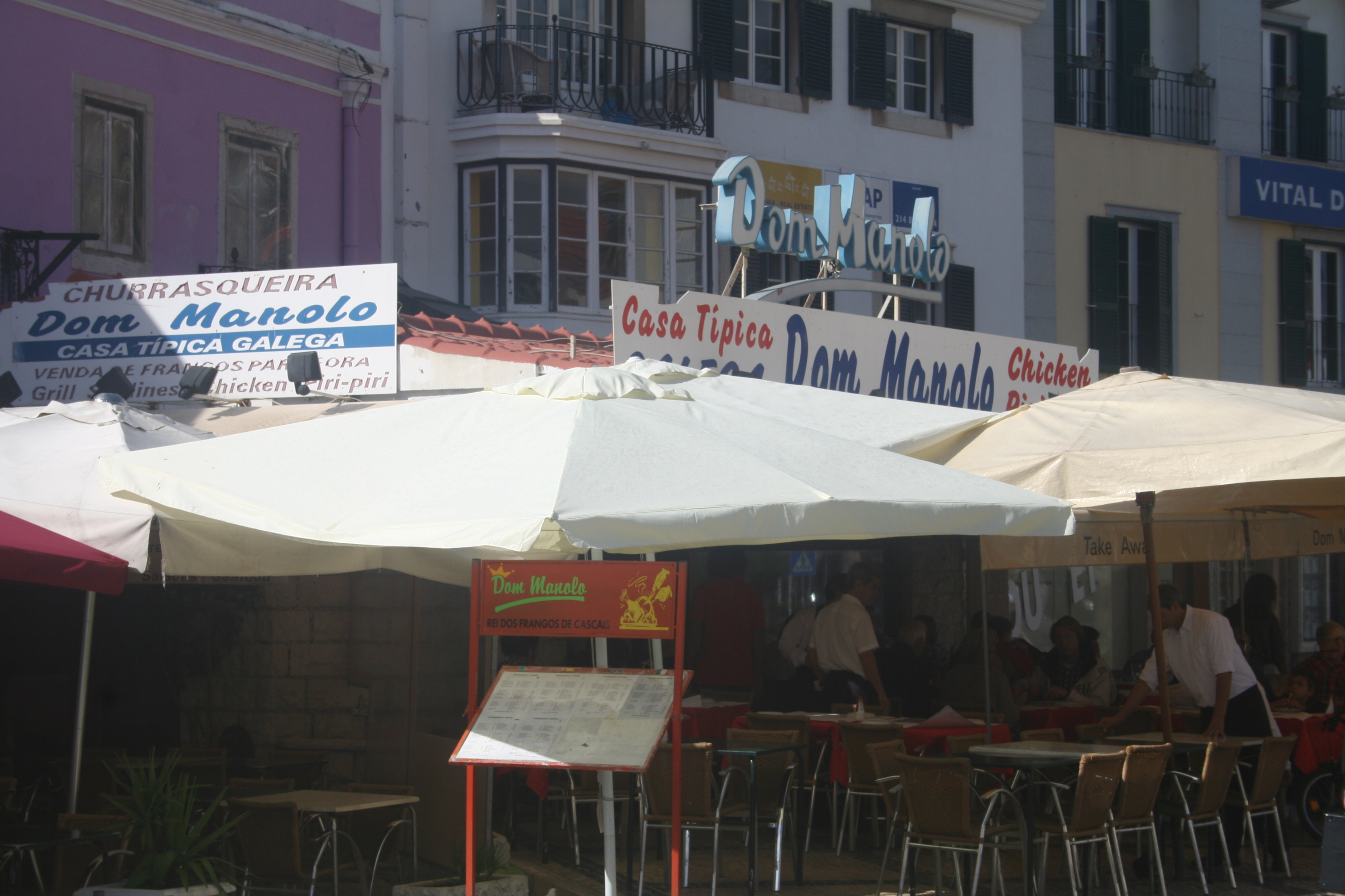 On to Cascais, a seaside fishing village, still functioning in that capacity, but also a tourist destination. Even in the off and on rain we could see why. It wraps around a neat little harbor, and there are hilly cobblestone streets lined with shops and restaurants. Very colorful and picturesque. It was lunch-time, so we quickly found a table outside at a place Marina had recommended, Dom Manolo, where the local favorite, grilled sardines was reported to be the best. We