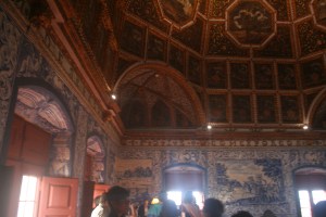 original Moorish construction remains but a section of floor in one of the rooms, but Moorish influence abounds throughout in the tile work and many arches. It is a truly grand and beautiful place, rivaling Versailles, we thought. Generations of Portuguese royalty lived here, and much of their furniture, art works, and accoutrements remain. There are mullioned windows in the