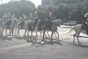 closed for tours, but even from afar we could tell something was going on. There was a large contingent of mounted Government Guard outside. Our intrepid guide, Marina, led us closer for a look in intermittent showers. She suspected some foreign dignitary was coming to present credentials, and that proved to be the case. We didn’t see who it was, but we did snap some photos of these snappy dudes.