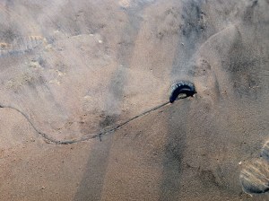 On one of our morning walks we saw many of these small Portuguese Man O War washed in. This was actually one of the biggest; the majority were tiny– two-inches or less– with a single tentacle of two feet or more, their perfect little gas-filled sails an iridescent indigo. They have no independent means of mobility; the bag acts as a sail in the wind, but it is a craft without a rudder, and when an east wind blows long enough, they blow ashore. That’s they way it is.