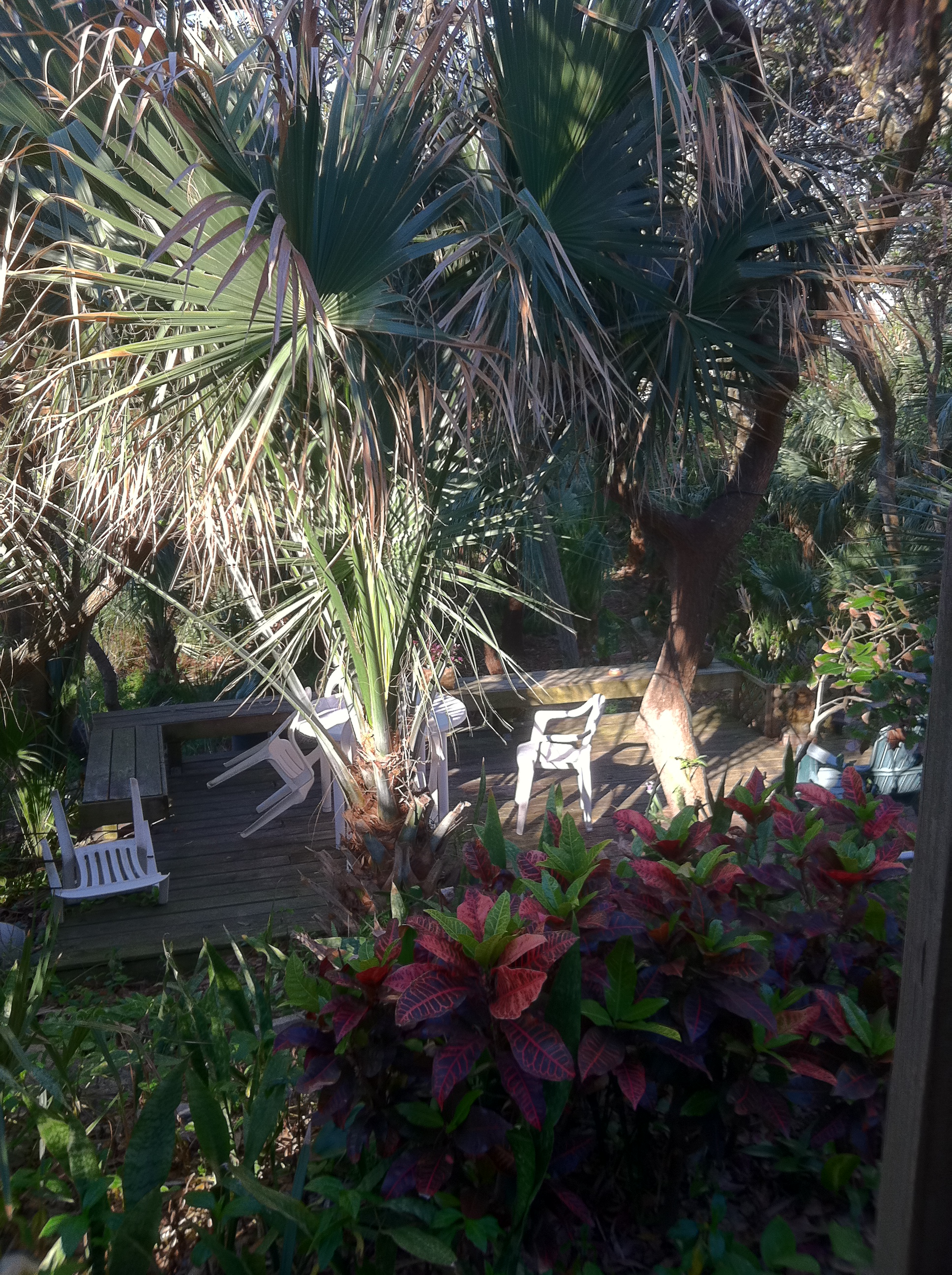 to spend an evening, weather permitting. The outdoor shower we use when coming up from the beach offers a lovely panorama over the crotons. For many years the Outback has been home to doves, Cardinals in spring, several rascal squirrels, the occasional raccoon and ‘opossum, a Great Horned Owl for a time, various snakes, box turtles, and a Gopher Tortoise. Three cats are entombed there.