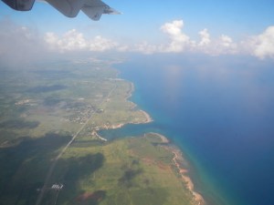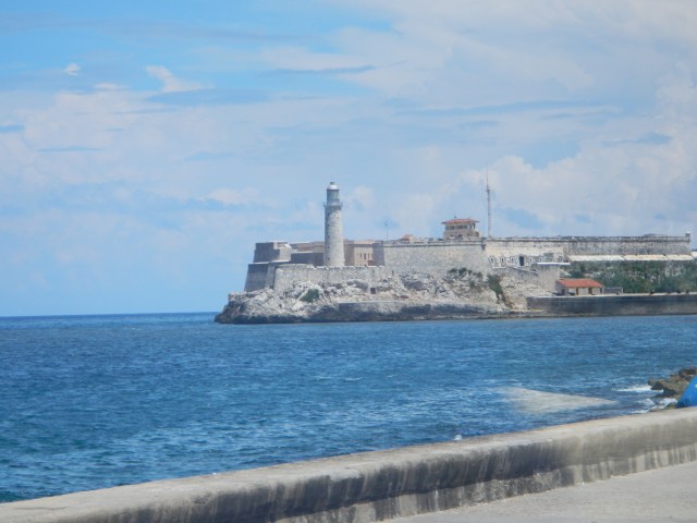 We left the hotel as a group at 6 and were taken via shuttle to the airport.  Finding our departure terminal after a half-mile walk, we settled in with a latte and waited.  At 9 we departed in a twin-engine prop charter and, following the Keys, were soon over the Straits, and not long after, we got our first look at the coast of the island of Cuba. We landed at the very small Jose Marti airport, Havana, at about 10:45 and entered the terminal, where we found . . . no one.  Officials inside seemed completely surprised by our presence.  One of the first off the plane, I tried to answer, in my poor Spanish, what we were doing there, and how many we were.  I guess it was enough.  There were about six little cubicles with a narrow passage between, the customs booths, and were told to pass through one at a time.  Inside the one I chose were two very serious uniformed young men.  Barbara went through ahead of me, spent a few minutes answering questions, and was sent back out to the room in which we had started.  I entered the same booth.  Examining my passport, visa and ticket, they did not appear welcoming at all, and emitted a sinister vibe, but after a photograph, I was gestured into the next room, where the security scanner was.  Barbara was still out in the ante-room, and for an agonizing five minutes, I waited, certain she had triggered some alarm and was off to a Cuban jail.  Everything said the night before seemed to be coming true, and we were all alone.  Still no guide.  Barbara finally came out, we breathed a sigh of relief, and, with no explanation as to why she was briefly detained and no other choice, we cleared the scanner, and waited for our bags.  They quickly arrived, we collected them, and then there she was!  Our Cuban guide, smiling and waving and directing us to bus 437 parked outside.  We exited the terminal into brilliant sunshine and heavy humidity and got our first look at a visual phenomenon that would become both a familiar comfort and a bittersweet irony, the American Cars.