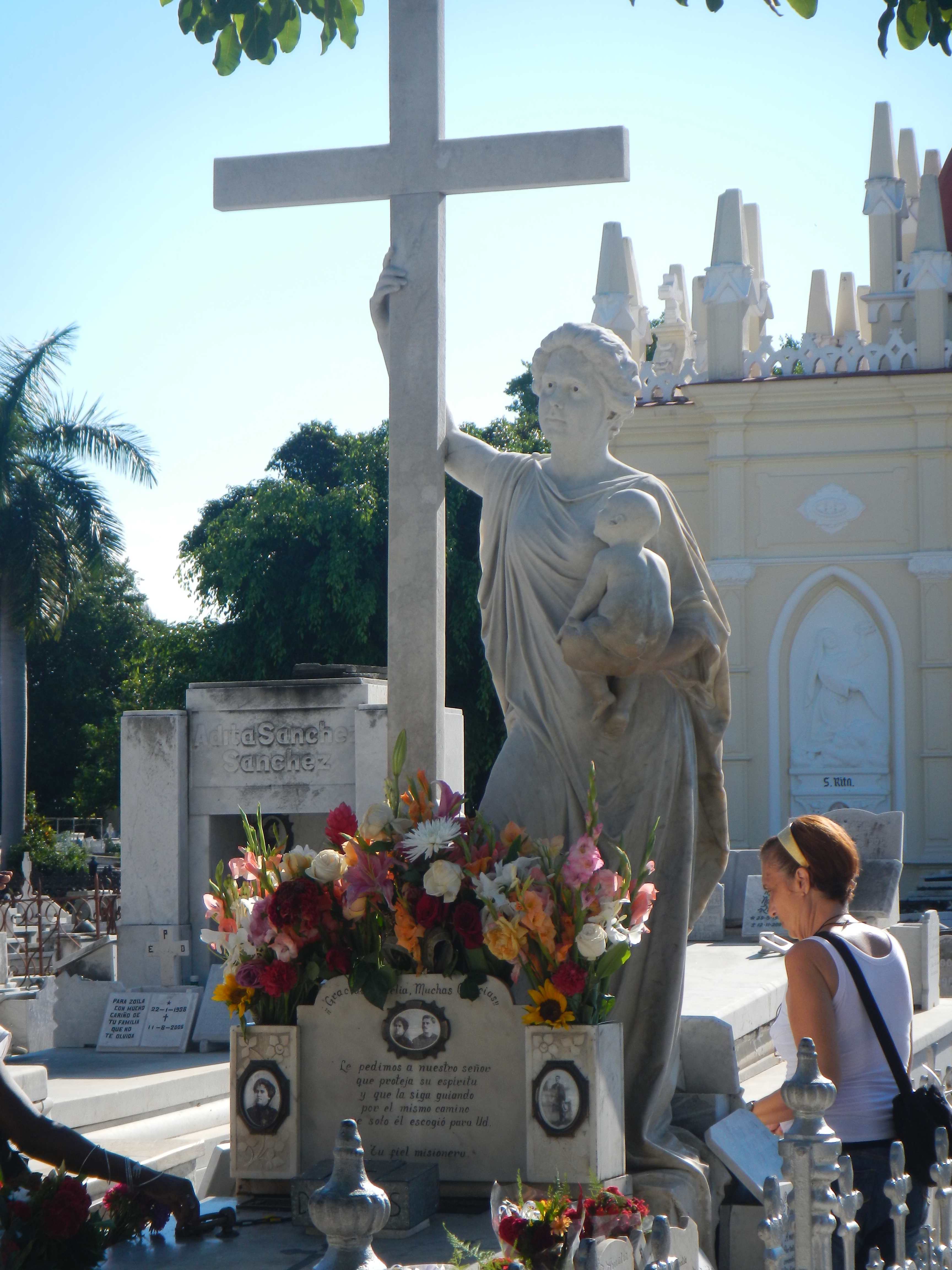 But the most intriguing was this tomb visited daily by hundreds, not only Havana residents, but folks from around the world. It is the burial place of a young woman named Amelia and her infant child, both of whom died in childbirth. Our guide told us a long story of how this woman and her husband overcame family disapproval and other obstacles to be together, and that they were very much in love. When Amelia and the baby died, the baby was buried with her, lying at her feet. The husband was inconsolably distraught, and insisted his wife and child were not dead but only sleeping. He spent days on end at the grave tapping on the crypt with an attached ornamental brass ring, tapping to wake Amelia. Finally, to prove to him she was indeed dead, the family opened the tomb, and it is said that the baby was not at Amelia’s feet where it had been placed at burial, but cradled in her arms.