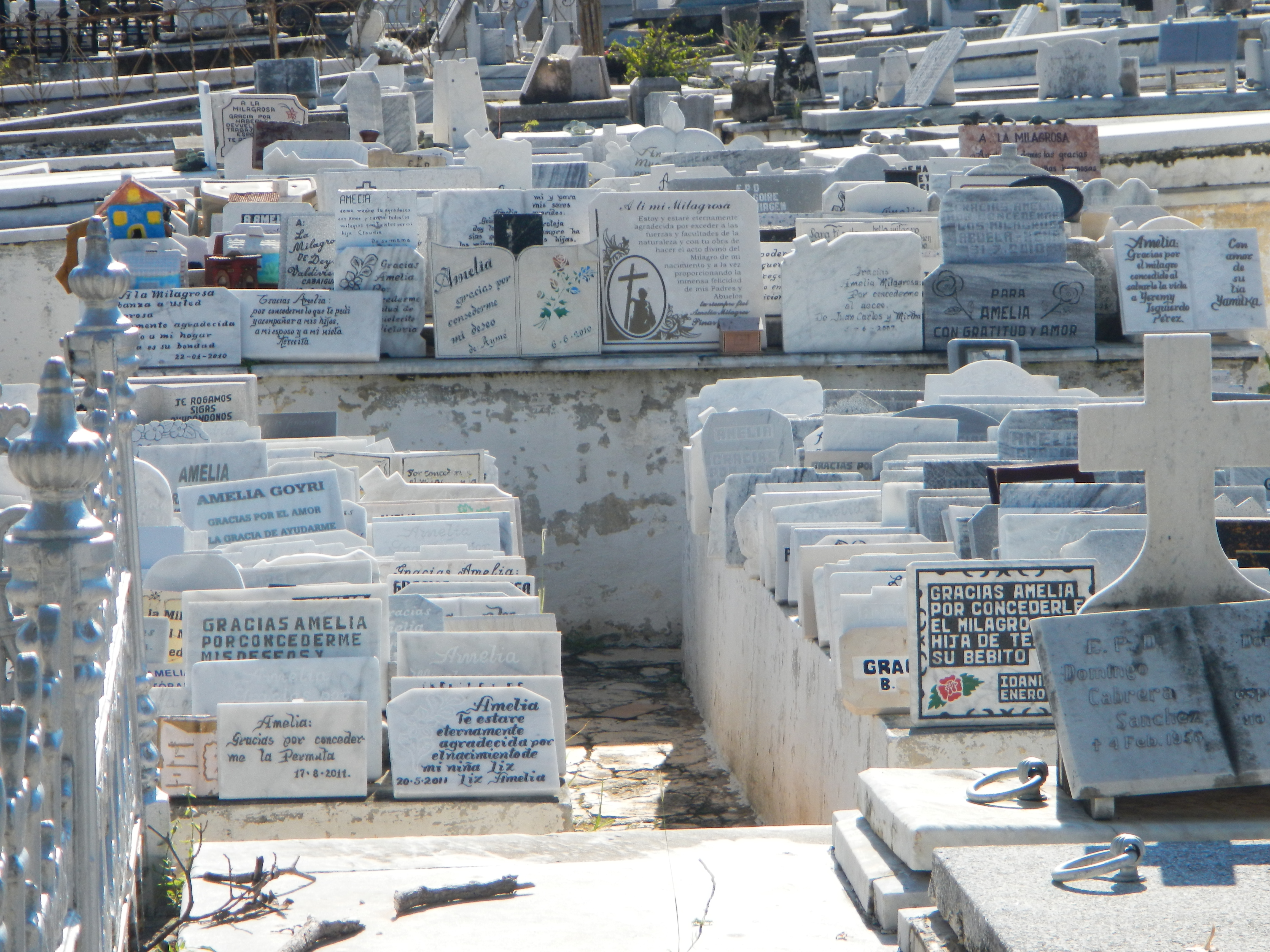 Word of this milagro quickly spread, and pilgrims began coming to tap on the crypt and ask for miracles in their lives. In the 15 minutes or so we were at this site three women came along to tap and pray. A great many flowers stood at the foot of the tomb. It was not yet 10 in the morning, and our guide said these were flowers from just today. Next to the crypt was an area of perhaps fifty by fifty feet filled with small flat marble plaques, each one thanking Amelia for a miracle in their life for which they had prayed. The guide showed us several from the States. There is a movement underway to have Amelia Canonized, and ultimately named a Saint. It was a remarkable and moving place.