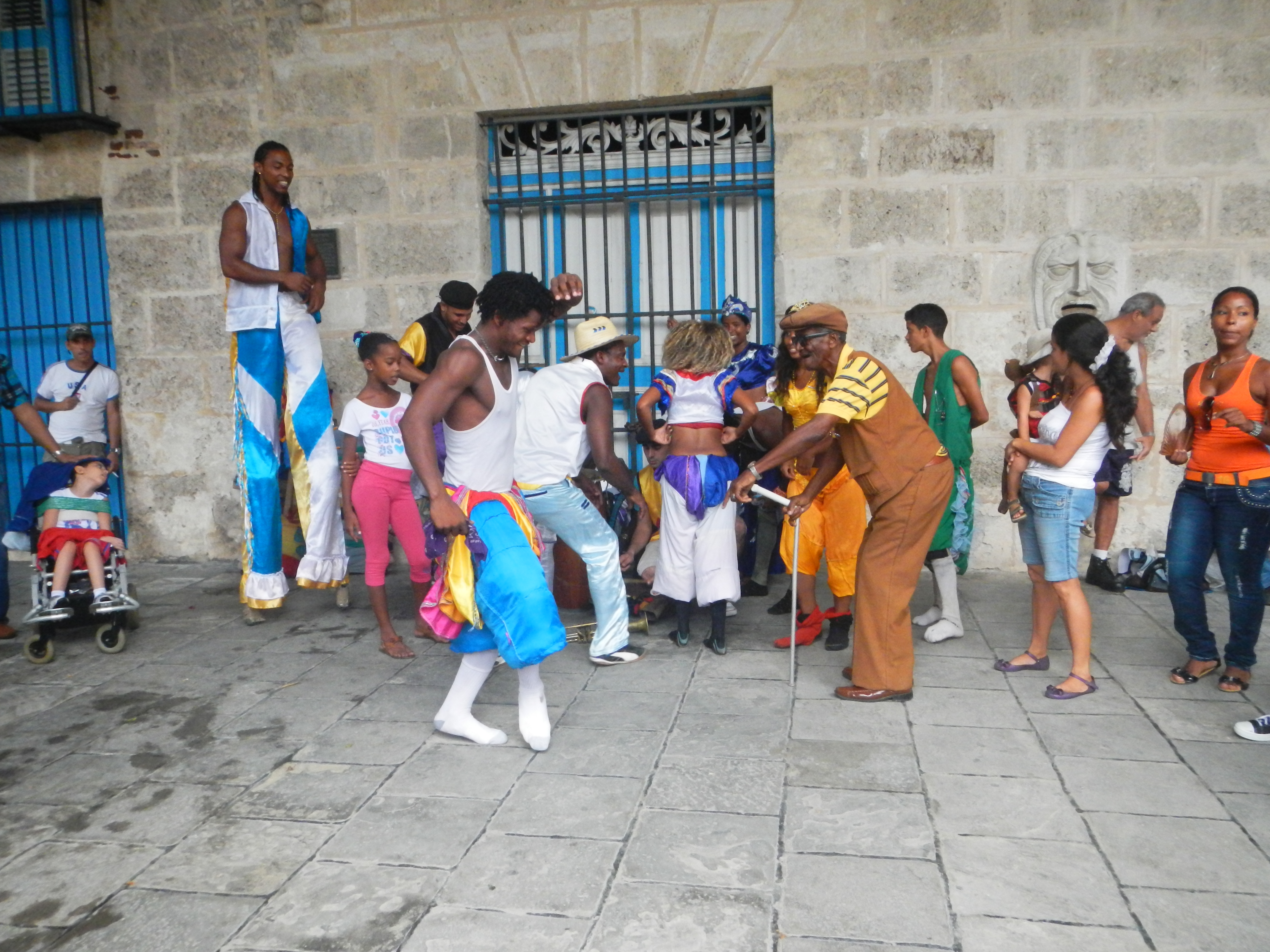 Lunch was on our own, so after being dropped near Cathedral Square, with instructions to meet in front of the church at a designated time, folks struck out on their own, several to a restaurant across the square, while Barbara and I ascended the portico with a view of the whole square and lit up. We heard a street troupe coming down one of the side streets, trumpets, percussion, etc. and they came into view just as the rain began to fall. They all ducked under the overhang with us, musicians, dancers, guys on stilts, all in brightly colored traditional Cuban costumes.