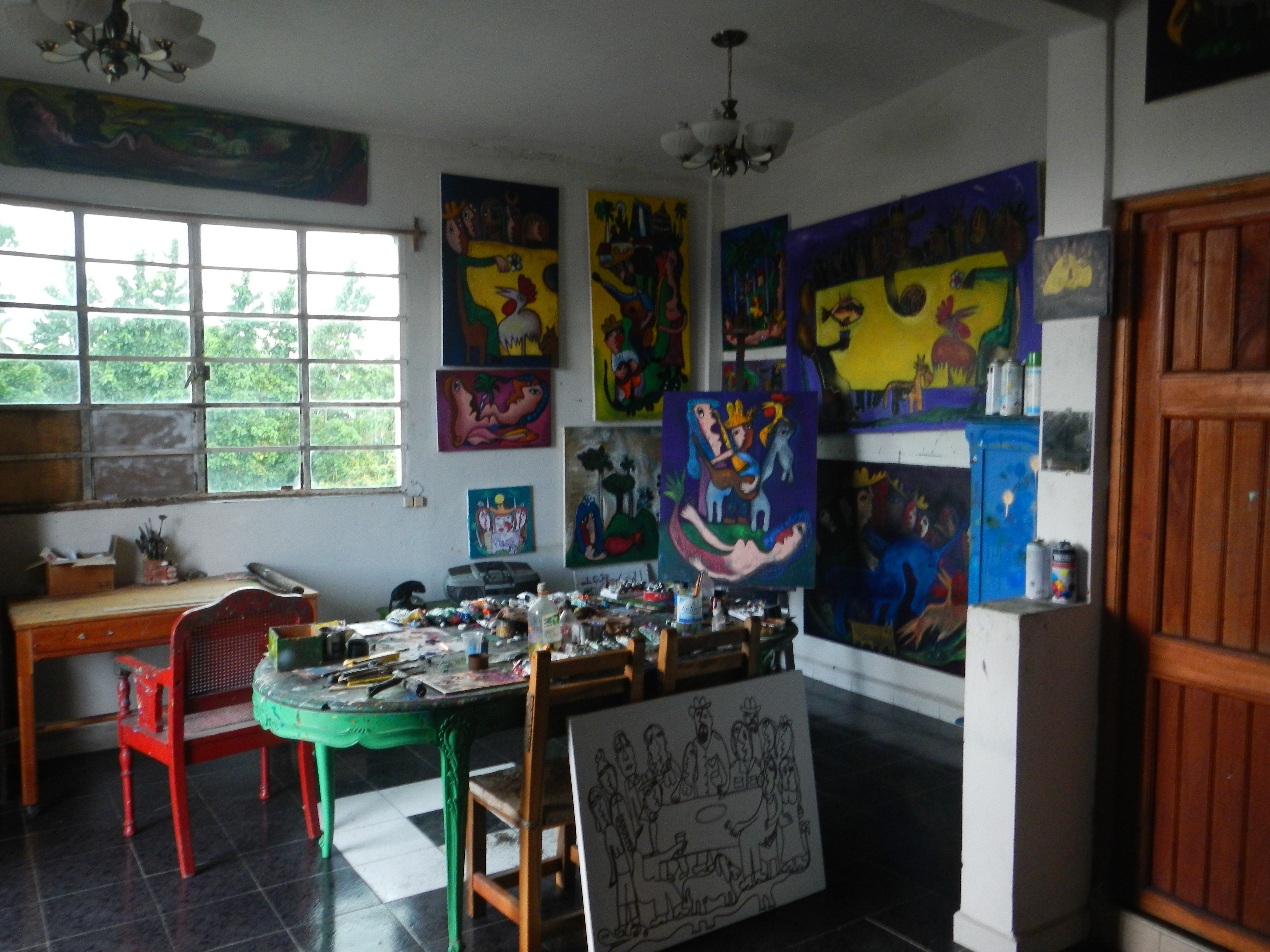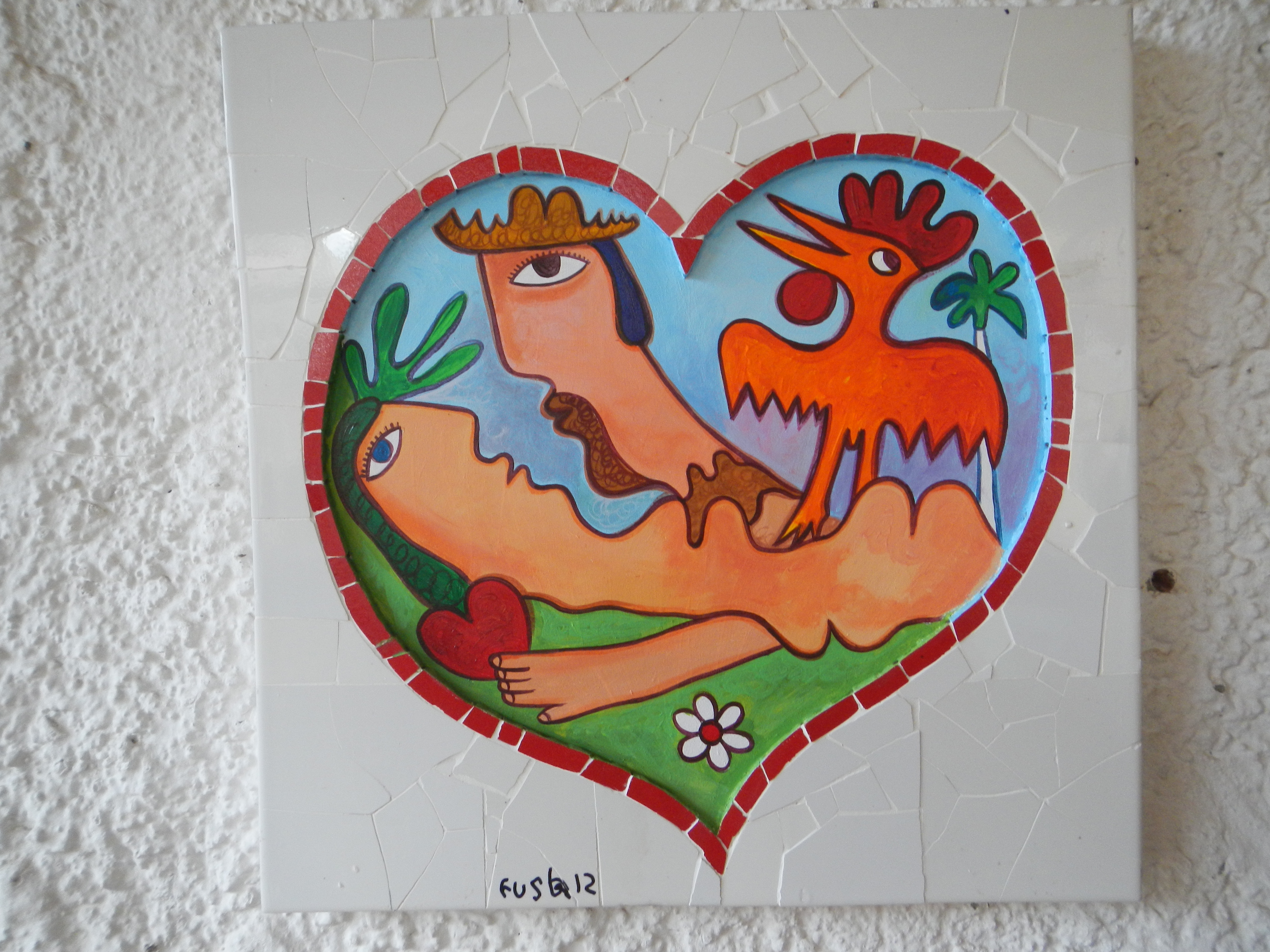 Courtyard, fountains, walkway, garage, every wall, every ceiling were covered in whimsical and jubilant designs by tiny tiles fired in Fuster’s upstairs studio. The artist himself was apparently not home, but we were graciously given the run of the place by one of his sons. We saw the pottery studio, where the tiles were made and fired in a big gleaming electric kiln, then went across a (tiled) elevated walkway to the painting studio, where a number of Fuster’s brilliant, tropical motif paintings were displayed.