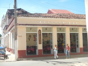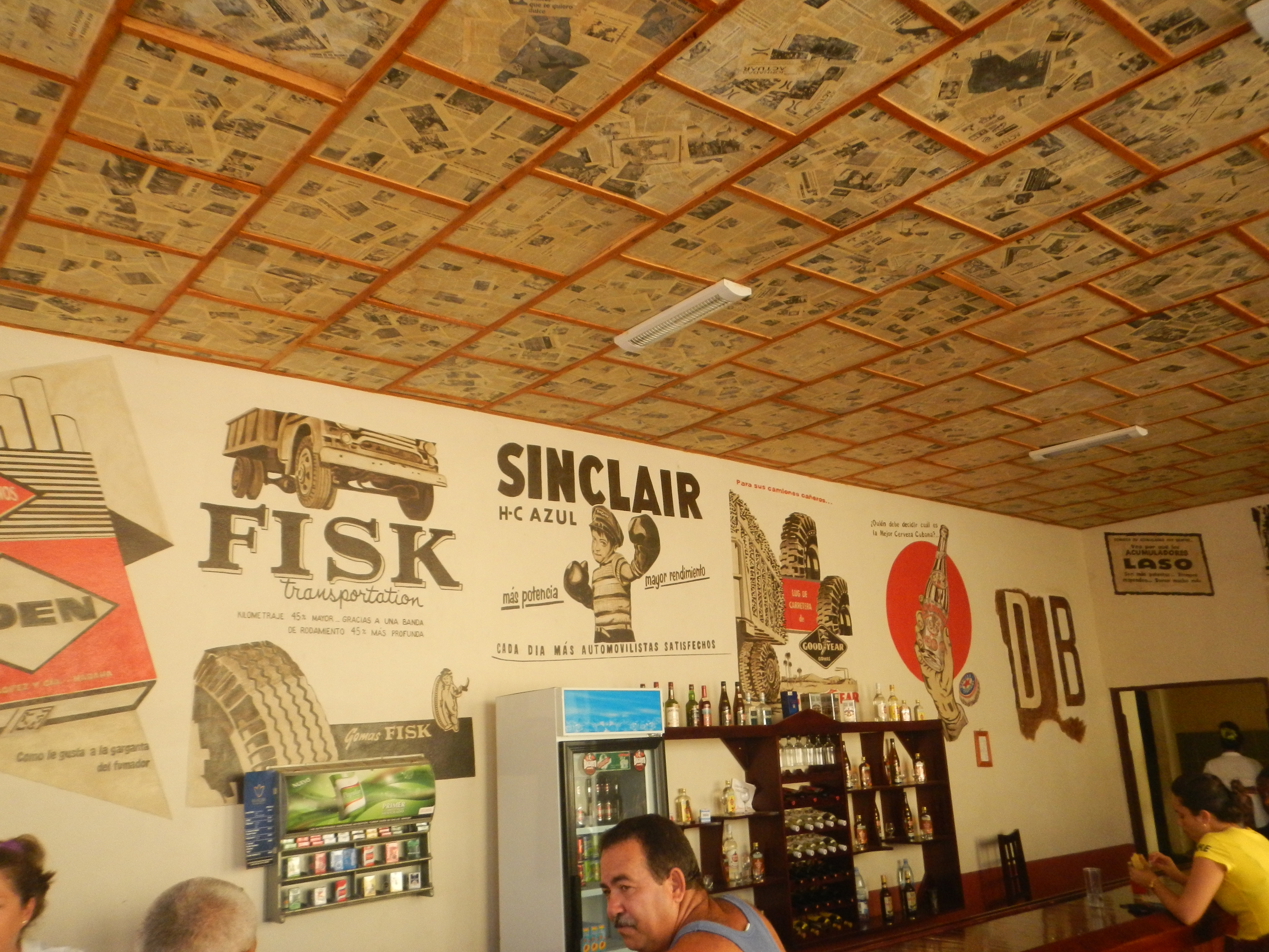 From the outside the place is quite reminiscent of Sloppy Joe’s in Key West. Taking its name from the bus and truck drivers who used to stop there on the way back and forth between the eastern and western provinces, the walls have been painstakingly covered with hand-painted advertisements of the period, and the ceiling covered with period newspaper pages. Quite impressive. On our walk back to the bus the artist told me he had visited the U.S several times, as a guest of the Cleveland Museum of Art, which had brought him in for conferences with other