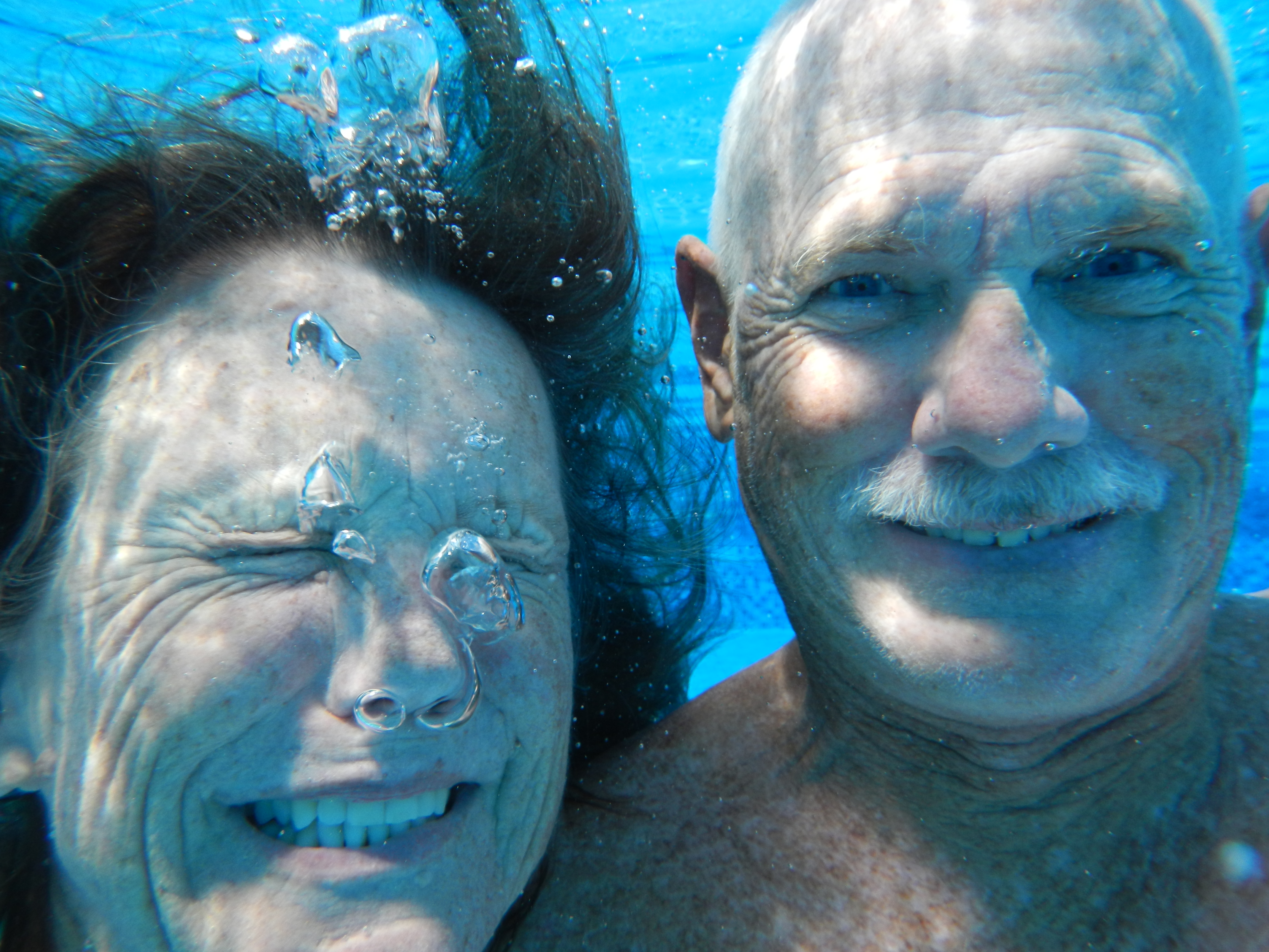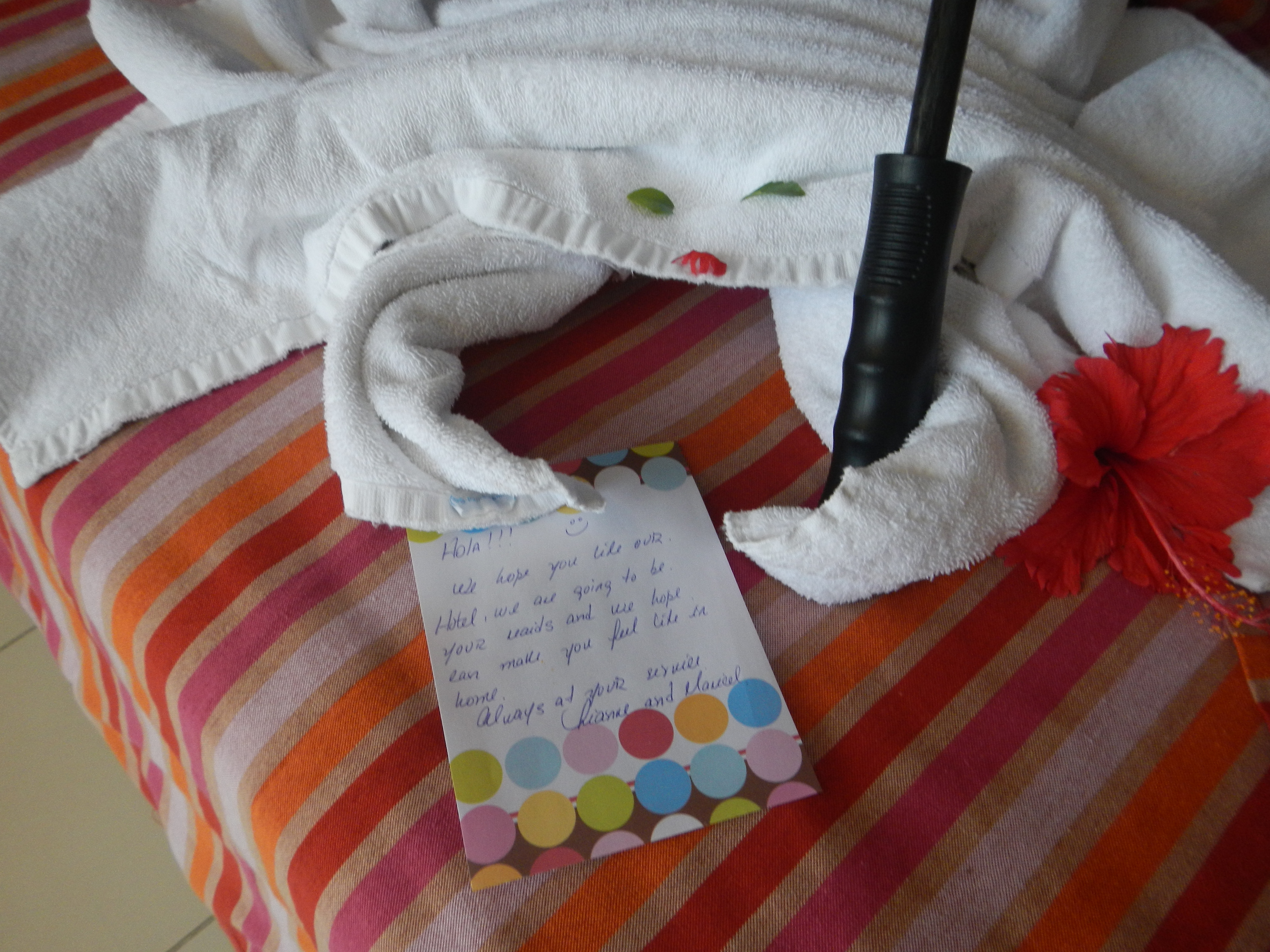 We found this lovely towel display and note from our hotel maids when we returned, and another of a swan in the bathroom. The note reads, “Hola! We hope you like our hotel. We are going to be your maids and we hope we can make you feel like in home. Always at your service, Dianne and Mariel.” The staff in this place were gracious, efficient and always friendly. We left a good tip for these ladies. There was time for a little more beach and pool time before our farewell dinner at the beach restaurant, and we took full advantage. Lunch first at the snack bar by the main pool, then a dip in that pool, in which we tried out some creative underwater photography.