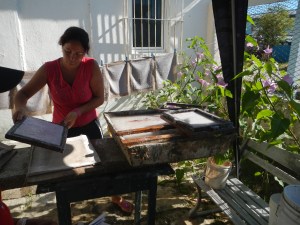For instance: this is a young woman outside in front of the house engaged in making paper to be used in print making. I have been learning this process and was pleased to see that I am on the right track, with my set-up being nearly identical. Scraps of old paper- newsprint, stationary, whatever -are ground with water, (I use an old blender) to make a wet pulp. You can add flowers, leaves, threads, etc. to give it all kinds of character. You add the pulp to a deep pan of water, making the mush thicker or thinner to your liking, then dip a rectangular frame covered with screen, lift it out to drain, then transfer the drying pulp to a waiting cloth, like canvas scraps. You then hang these on a line to dry, peel off the paper and there you have a wonderfully textured surface perfect for block and press printing.
