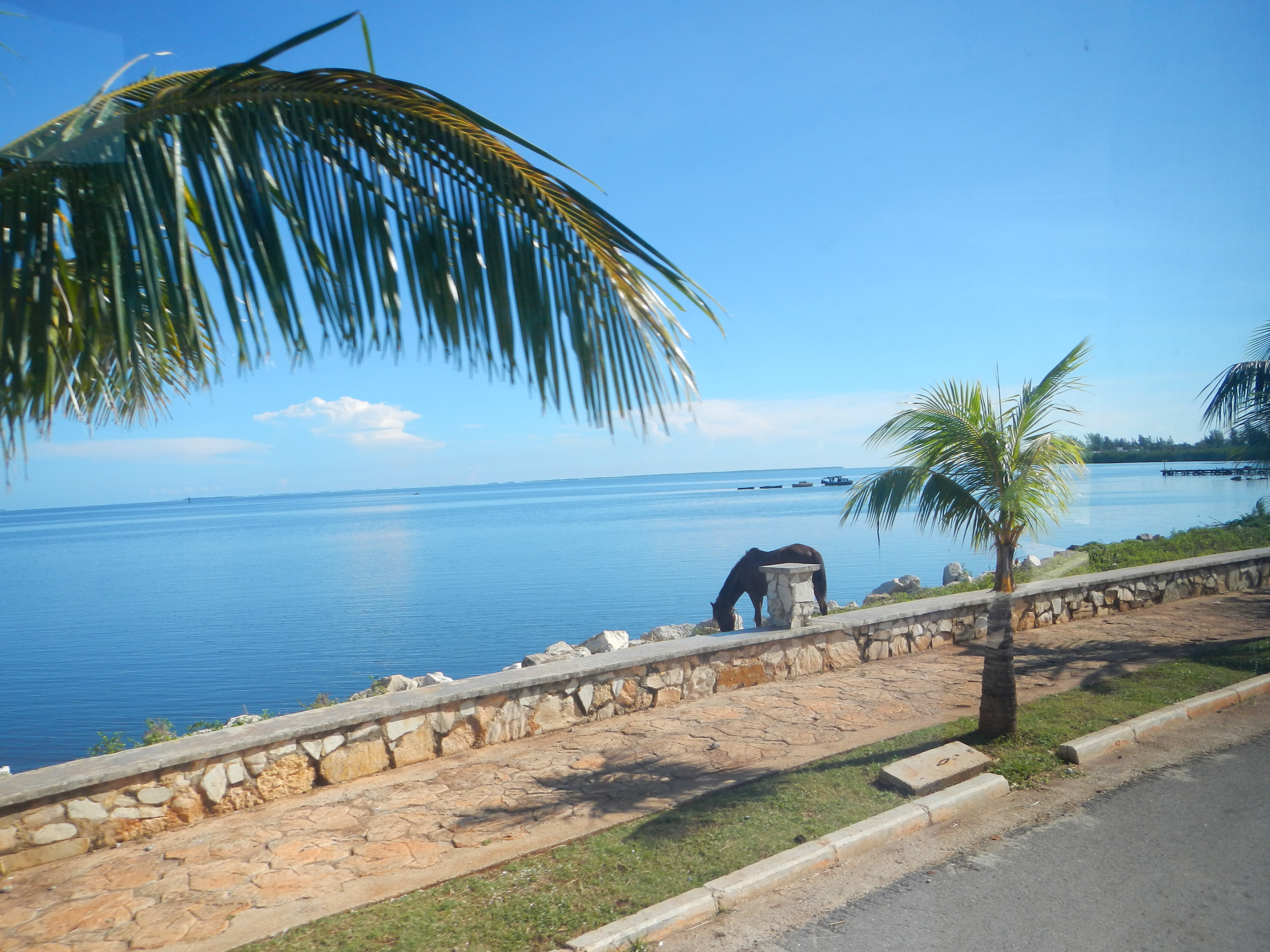 In perfect summer weather, we then drove along the Remedios Malacon, with beautiful views of the ocean, some fishing boats, and grazing horses, of all things. The sea there, protected by the many mangrove islands offshore, was incredibly placid. It was a lovely place. On the landward side, which I could not get decent photos of, were some buildings and walls that had been decorated by a local artist whose home and studio we were heading to visit.