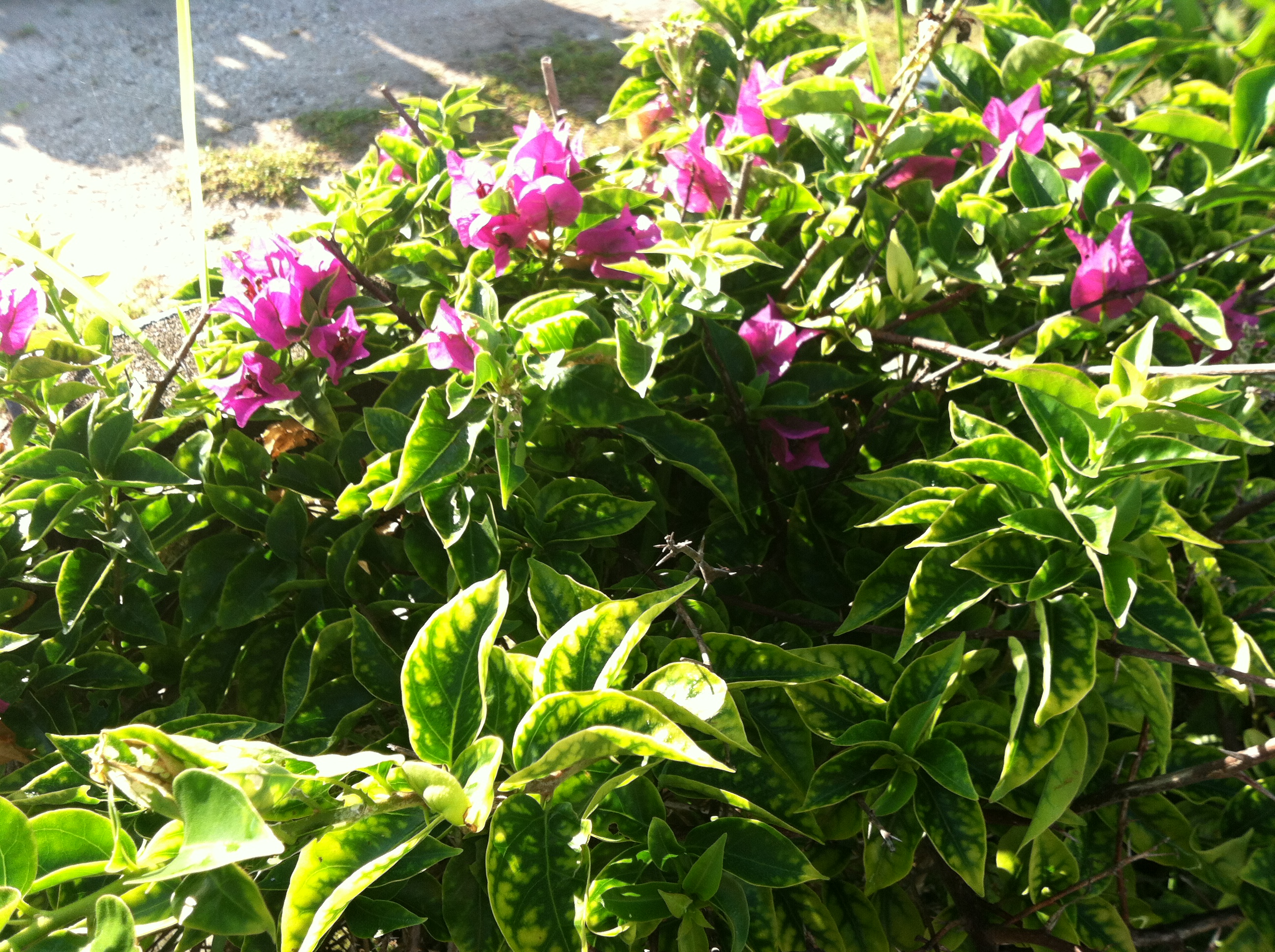 All of which should, but does not, cause me some alarm. Rather, I have been inclined, perhaps because of my prolonged inactivity, to entertain a rich, if eccentric little fantasy of the house actually being consumed by the encroaching vegetation. Things growing through the windows, across the floor and up the walls. Imagine the light. I think it would be like living in a Magic Realism novel, all hot, steamy, strange and very, very green. The Bougainvillea would be first, I believe, owing to its ability to send out long, thorny tendrils– of astonishing tensile strength, by the way– the advance team, if you will, breaking out glass, scouring plaster, the beauty of its flowers disguising an underlying, relentless intent that one would simply have to let go and accept, ultimately. The beach sun flowers would be next, finding root sustenance in throw rugs and wood floors; then the aloe, inching across the Mexican tile (they require so little.) the palmettos would be last, I think, but being the most muscular, the most damaging. Walls would not be immune.